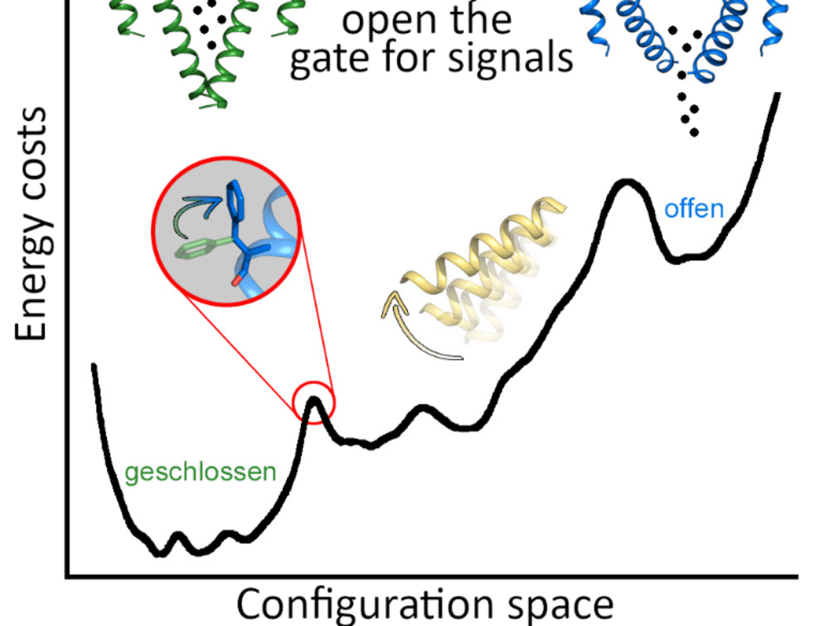Die Biologie macht sich die Existenz von mehreren suboptimalen Lösungen zunutze. So kann zwischen diesen hin- und hergesprungen werden, wodurch das flexible Agieren von Lebewesen erst ermöglicht wird. So funktionieren auch die Nanomaschinen, aus denen unser Körper besteht. Sehen Sie sich zum Beispiel das Öffnen und Schließen des Ionenkanals eines biologischen Neurons in Abbildung 6 an.