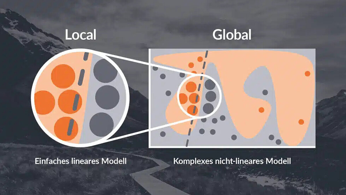 LIME (Local interpretable model-agnostic explanations) involves training a local “surrogate model” for an example. Put simply, LIME takes a defined input (an example), processes it through the black-box model, and then analyzes the output. The features of the example are then slightly altered one by one, and the new example is sent through the black-box model again. This process is repeated many times. This allows an explainable model to be created, at least around the initial example, which shows the influence of the features on the output. Using the example of automatic claim processing by a car insurance company, this would mean repeatedly changing the features of a claim slightly (vehicle type, age, gender, amount, etc.) and testing how the AI model's decision changes as a result.