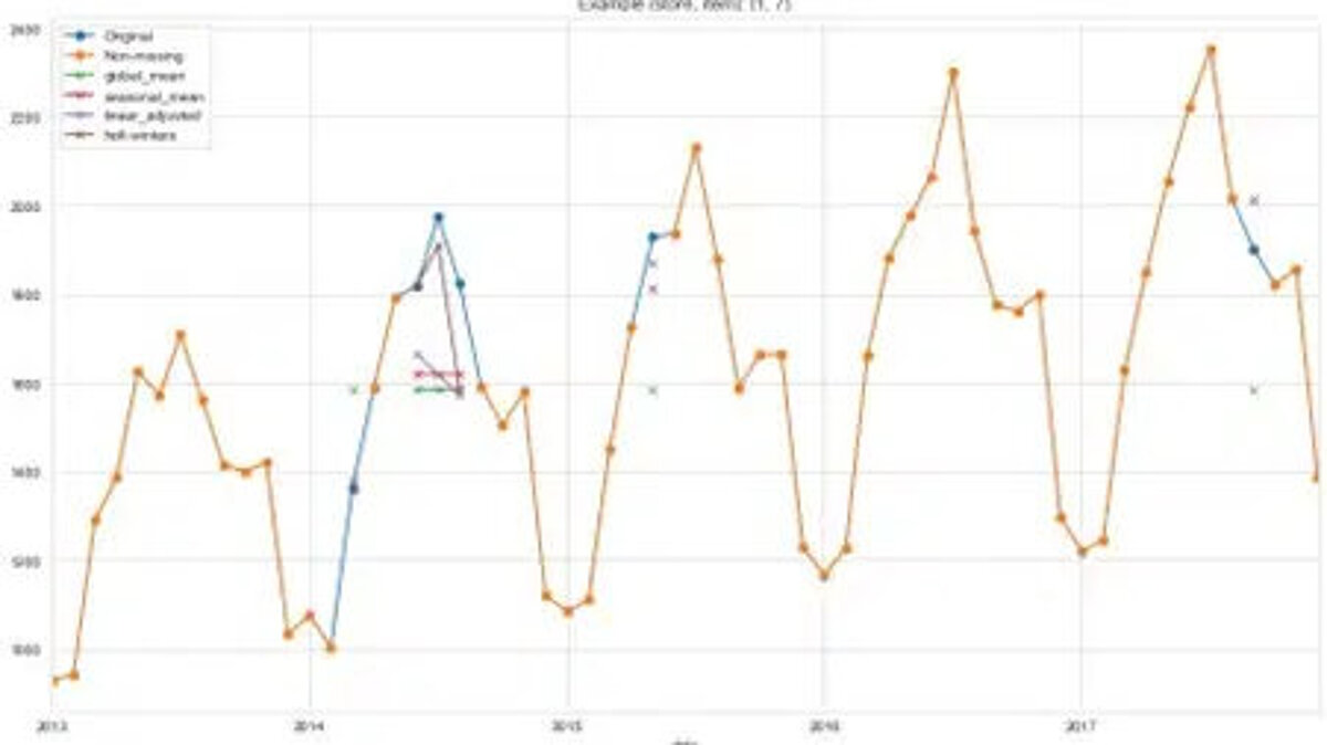 The graph below shows the sales records for item 7 from store 1. The orange line describes the complete data available to us. The blue line shows the data we removed from the series for our experiments. The small crosses in different colors show the imputed values calculated using different methods. You can see that the linear fit and Holt-Winters imputation methods are better at capturing the variations in our time series. Because the data contains a trend and seasonality, the two methods that take trend and seasonality into account perform best. This confirms the rule of thumb we presented in the figure above.